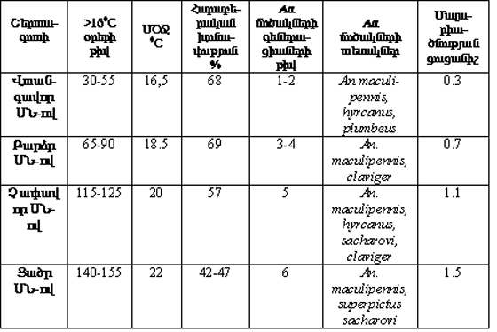 Արմավիրի մարզում An. sacharovi-ին գերակշռել է` 54,2%, իսկ Արարատի մարզում` գերակշռել է An. maculipennis-ը` 54,1%: Գյուղական բնակավայրերում An. sacharovi-ին կազմել է 23,5-76,7%, քաղաքայինում` 14,3% (Մասիս)- 52,2% (Արտաշատ): Սա ցույց է տալիս An. maculipennis-ի տարածվածությունը և An. sacharovi-ի բարձր դեպքայնությունը: Մասիսում և Գրիբոեդով գյուղում, որտեղ գերակշռել է An. maculipennis-ը, իրականացվել է նաև 24 առանձնյակի մոլեկուլյար հետզոտություն, առանձնյակները տարբերակվել են ԱՏՍ-2 մոլեկուլյար մարկերով: Դրանց օգնությամբ բացահայտվել են փոխանցողի պոպուլյացիան նկարագրելու բնութագրիչներ: Վերջիններիս օգնությամբ ևս կատարվել է տարածքի շերտաբաժանում` համապատասխան քարտեզների մշակմամբ:
