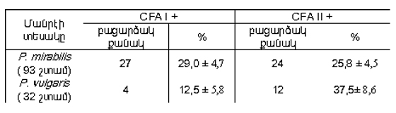 Ինչպես երևում է ներկայացված արդյունքներից` P. mirabilis-ի հետազոտված շտամների 29,0 ± 4,7 %-ի մոտ հայտնաբերվել է CFA I գործոնը, իսկ 25,8 ± 4,5 %-ի մոտ` CFA II գործոնը, մինչդեռ P. vulgaris-ի մոտ CFA I գործոնը կազմում է 12,5 ± 5,8%, իսկ CFA II գործոնը` 37,5 ± 8,6 %: