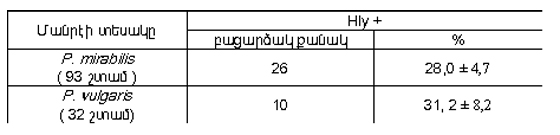 P. mirabilis-ի և P. vulgaris-ի շտամների մոտ հեմոլիտիկ ակտիվության ուսումնասիրության արդյունքները ներկայացված են թիվ 2 աղյուսակում: