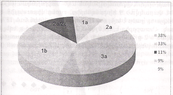 Մեր կողմից կատարված վերլուծությունները ցույց տվեցին, որ 45 հիվանդներից 17-ը (37,7%) ունեին 3a գենոտիպ, 15-ը (33,3 %)` 1b, 4-ը (8,8 %)` 1a, 4-ը (8,8%)` 2a, 5–ը (11,1%)` 2a/2c (նկ. 1): ՀCՎ-ի տարբեր գենոտիպերի և հակա-ՀCՎ-ում 1F7 Id-ի քանակության միջև որևէ փոխկապակցվածություն չենք հայտնաբերել: