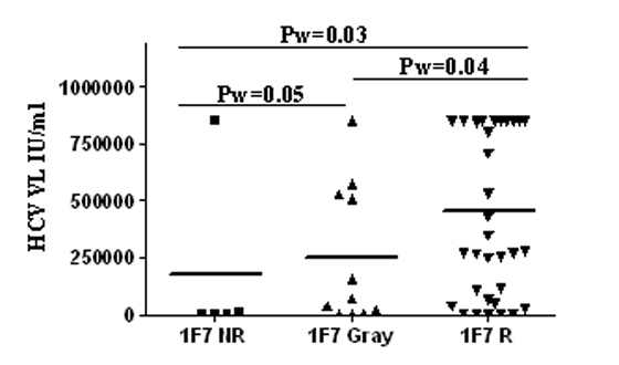 Մենք հետազոտել ենք վիրուսային ծանրաբեռնվածությունը 1F7 NR, Gray և R խմբերում: Ինչպես երևում է նկար 4-ից` վիրուսային ծանրաբեռնվածությունը նշանակալից ցածր է 1F7 չպատասխանողների մոտ, համեմատած` 1F7 պատասխանողների և 1F7 ուժեղ պատասխանողների հետ, իսկ 1F7- պատասխանողների մոտ նշանակալից ցածր է 1F7 ուժեղ պատասխանողների համեմատ (նկ. 4):