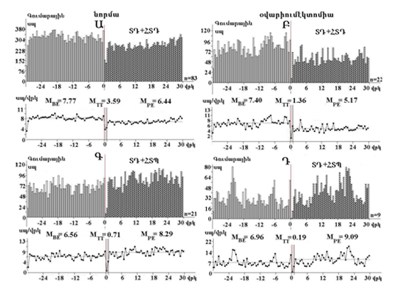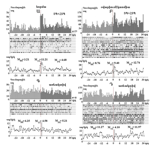 Նկար 1. Մեյներտի կորիզի նյարդաբջիջների սեպային ակտիվության գու-մարային պերիստիմուլային հիստոգրամներ (վերևում), կառուցված ռաստրի ձևով, ներկայացված առանձին բջիջների ֆոնային (ձախից) և հիպոկամպի բարձր հաճախականությամբ գրգռմամբ հրահրված հետստիմուլային (աջից) դրդիչ`ՏՊ+ՀՏՊ ակտիվության (Ա, Բ) և առեակտիվության (Գ, Դ) հիման վրա և նրանց իսկ միջին հաճախականության դիագրամներ (ներքևում) բնականոն (Ա, Գ) և օվարիումէկտոմիայի (Բ, Դ) պայմաններում: MBE, MTT, MPE` միջին հաճախականության թվային արժեքները նախա, ստիմուլային և հետստի-մուլային ժամանակահատվածներում համապատասխանաբար: