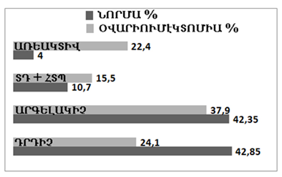 Նկար 3. Արգելակիչ, դրդիչ, առեակտիվ և ՏԴ + ՀՏՊ պատասխանների մասնաբաժինը (արտահայտված %-ով) նորմայում և օվարիումէկտոմիայի պայմաններում: