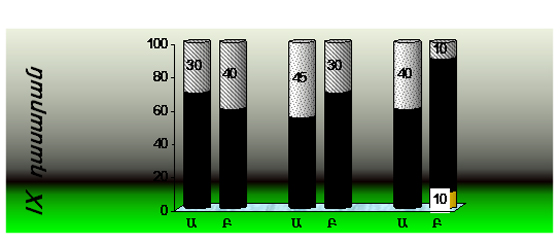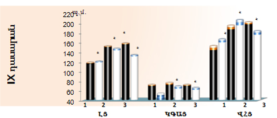 IX դասարանում նախաքննական շրջանում դիտվել է լարվածության աստիճանի բարձրացում: Փորձնական խմբում նախաքննական շրջանում նորմոտոնիկները կազմել են 65, իսկ սիմպաթոտոնիկները` 35%: Ստուգիչ խմբում հետազոտվողների 50%-ը եղել են սիմպաթոտոնիկներ, իսկ 50%-ը` նորմոտոնիկներ: Քննությունից անմիջապես հետո փորձնական խմբի աշակերտների մոտ լարվածության աստիճանը նվազել է, ինչի մասին է վկայում նորմոտոնիկների թվի աճը ի հաշիվ սիմպաթոտոնիկների` 80 և 20% համապատասխանաբար: Հետքննական շրջանում ստուգիչ խմբում դիտվել է լարվածության աստիճանի բարձրացում, որի արդյունքում սիմպաթոտոնիկների թիվը բարձրացել է` հասնելով 75%-ի (նկ.2): Հետազոտվողների սրտի ռիթմի ինտեգրալային ցուցանիշների մաթեմատիկական վերլուծության արդյունքում նախաքննական շրջանում ստուգիչ խմբում դիտվել է ԼՑ-ի հավաստի բարձրացում` 29,17%: Հետքննական շրջանում հոգեհուզական լարվածությունը ստուգիչ խմբի հետազոտվողների մոտ պահպանվում է, որի հետևանքով ԼՑ-ի մակարդակը ելակետայինի համեմատ մնում է բարձր 34,28%-ով (նկ.3):