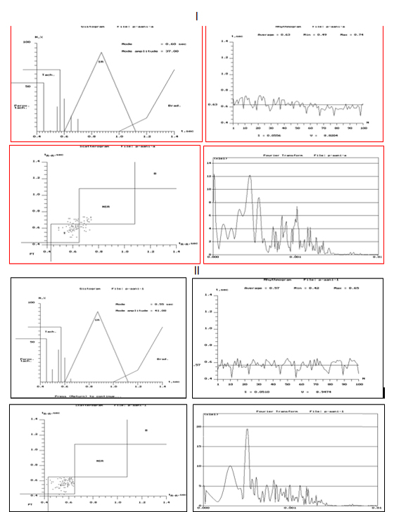 I – R-R ինտերվալների միջին մեծությունը` 0.63 վ; ՍԿՀ – 84 զ/ր; մոդա (Mo)- 0.6; մոդայի ամպլիդուդա (AMo) – 37; R-R ինտերվալների առավելագույն արժեքը – 0.74 վ; R-R ինտերվալների նվազագույն արժեքը – 0.49 վ; S – 0.056; վարիացիոն գործակից (V) – 8.82; ԼՑ – 123.3; ՌՎՑ– 6.67; ԿԳԱՑ- 61.67; ՎՀՑ -148.0: