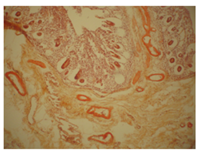 | Նկ.1. Ամիլոիդային դեպոզիտներ բարակ աղիների ենթալորձային շերտի անոթների պատերում, կոնգո կարմիր, x400 |