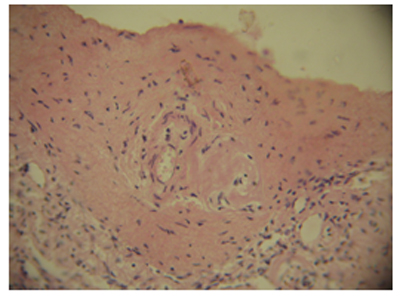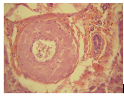 Նկ. 2. Ամիլոիդային կուտակումներ լյարդի դրունքային զարկերակի պատում,հեմատոքսիլին- էոզին, x400 |