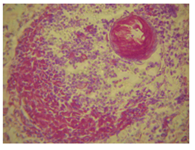 Աուտոպսիոն նյութում ամիլոիդային խպիպ` ուղեկցված գեղձի չափերի մեծացումով դիտվել է 2 դեպքում (3,8%):