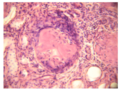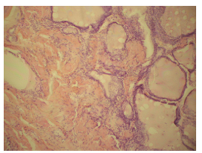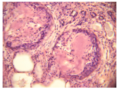 Վիրահատական բիոպսիոն և աուտոպսիոն նյութի ուսումնասիրությամբ վահանագեղձում հայտնաբերվել է հենքի զգալի ամիլոիդոզ` ուղեկցված ֆոլիկուլների ապաճումով: Դրանց հարակից հայտնաբերվել են կիստոզ լայնացած ֆոլիկուլներ (նկ. 5): Ամիլոիդոզն արտահայտված է եղել հատկապես մանր անոթների պատերում: Որոշ տեղամասերում ամիլոիդային կուտակումներին կից հայտնաբերվել են արտահայտված լիմֆոցիտար, պլազմատիկ բջջային ներսփռանքներ` ուղեկցված հսկաբջջային ռեակցիայով: