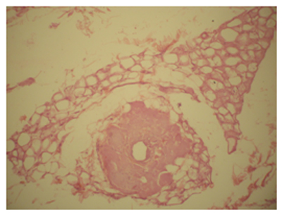 Մեր ուսումնասիրությունները պարզեցին, որ աուտոպսիոն նյութում ամիլոիդն առավելաչափ արտահայտված է եղել հետորովայ-նամզային բջջանքում և հարերիկամային ճարպաբջջանքում, իսկ նույն դեպքերում շատ նվազ քանակությամբ` ենթամաշկային ճարպաբջջանքում: Մանրադիտակային հետազոտությամբ ուսումնասիրված ճարպաբջջանքում հայտնաբերվել են ամիլոիդային դեպոզիտներ զարկերակների, երակների պատերում, առավելապես` ադվենտիցիայում և նրա շուրջ (նկ. 6): Երբեմն ամիլոիդը հայտնաբերվել է ճարպաբջջանքի հենքում` բլթակների արանքում, որոշ տեսադաշտերում բնորոշվելով առատ ամիլոիդային դաշտերի առաջացումով: Մյուս օրգանների (երիկամ, էնդոկրին գեղձեր, փայծաղ, աղիներ) ամիլոիդային ախտահարումները ևս այս դեպքերում ակնհայտ են եղել: