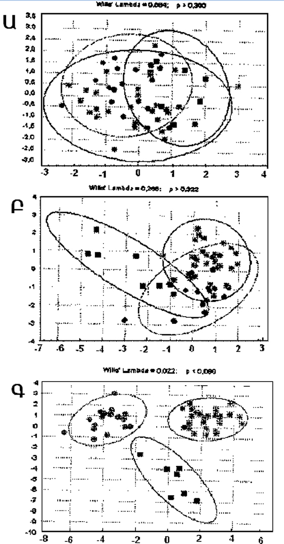 Այլ պատկեր է հաջորդ երկու գրաֆիկներում (Բ; Գ): Այստեղ դասակարգման ընթացքում օգտագործվել են 26 տարբեր ցուցանիշներ, այդ թվում նաև ռիթմոլոգիական: Ինչպես երևում է գրաֆիկներից խմբերը պահպանել են իրենց կառուցվածքը: Ուիլքսի լյամբդա վիճակագրության արժեքները վկայում են դիսկրմինանտության բարձր հզորության մասին: