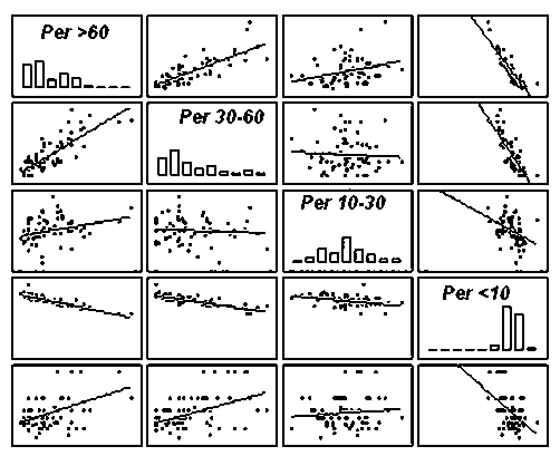 Նկ. 1. Դանդաղ և արագ ռիթմերի փոխկապվածության ռեգրեսիոն կորերի մատրիցա; Per … սպեկտրային խտությունների հզորությունները տատանման պարբերությունների համապատասխան տիրույթներում; Մատրիցայի անկյունագծով ցույց է տրված վերլուծվող պարբերությունները և նրանց բաշխման հիստոգրամները: Տրենդների վերընթաց ուղղվածությունը վկայում է ցուցանիշների միջև ուղիղ համեմատական կապվածության մասին և վայրընթաց ուղղվածությունը վկայում է հակադարձ կապվածության մասին: Գծերի թեքվածության աստիճանը հանդիսանում է ցուցանիշների միջև կոռելյացիոն կապերի սերտության արտահայտություն: