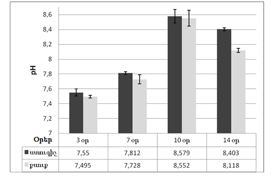 Բերված արդյունքները վկայում են, որ փորձարարական խմբի կենդանիների pH–ը միտում ունի փոքրանալու և 14-րդ օրը փորձարական խմբի pH–ի միջին արժեքը մոտ 0,3 միավորով փոքր է ստուգիչ խմբի pH–ի միջին արժեքից (p‹0,001):