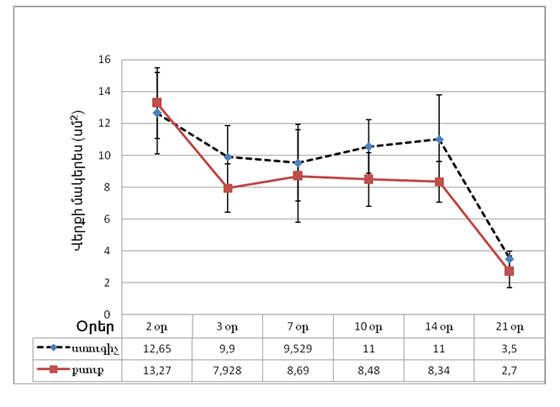 Նկ. 1 Այրվածքային վերքի մակերեսի փոփոխությունը ստուգիչ և փորձարարական խմբերում