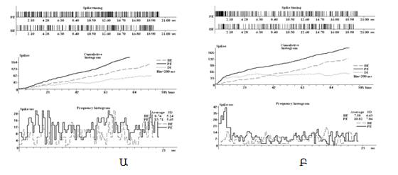 Նկար 3. ԵՎՏԿ-ի ՍԱԿ-ի էլեկտրական խթանմանը հետտետանիկ(Ա) և տետանիկ (Բ) ակտիվացմամբ պատասխանող նեյրոնների ժամանակային, կուտակային և միջին հաճախային գծապատկերները (վերևից) և նրանց քանակական բաշխվածությունը փորձարարական խմբերում (ձախից)