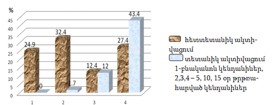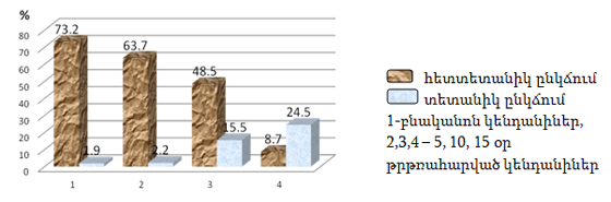 Առավել արտահայտված փոփոխություններ են նկատվել ՍԱԿ-ի էլեկտրական խթանմանն ի պատասխան ԵՎՏԿ-ի ակտիվացող նյարդաբջիջների քանակական վերլուծության ժամանակ: Եթե հետտետանիկ ակտիվացման քանակական ցուցանիշները թրթռահարման ազդեցությամբ էական փոփոխություններ չեն կրել, ապա դրան հակառակ, տետանիկ ակտիվացմամբ պատասխաններ, որոնք ընհանրապես բնականոն կենդանիների մոտ չեն գրանցվել, սկսել են նկատվել թրթռահարման արդեն իսկ 5-րդ օրը, իսկ 15 օր թրթռահարված առնետների ԵՎՏԿ-ի նյարդաբջիջների պատասխաններում տետանիկ ակտիվացումը եղել է ամենահաճախ գրանցված դրսևորումը (43,4%) (նկ.3): Այս փոփոխությունները ևս վկայում են, որ կարգավորման մեխանիզմներում գերակշռող դեր են ստանձնում ստորին անդաստակա-վերտեսողական ուղիղ կապերը, քանի որ տետանիկ ակտիվացումը խիստ արտահայտված է ՍԱԿ-ի էլէկտրական խթանման վայրկյանի սկզբնական հատվածում: