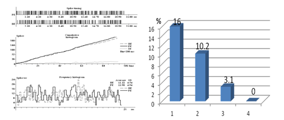 Նկար 1. ԵՎՏԿ-ի ՍԱԿ-ի էլեկտրական խթանման նկատմամբ առեակտիվ նեյրոնների ժամանակային, կուտակային և միջին հաճախային գծապատկերները(ձախից) և նրանց քանակական բաշխվածությունը փորձարարական խմբերում (աջից). 1- բնականոն, 2,3,4 – 5,10,15 օր թրթռահարված կենդանիների ցուցանիշներ