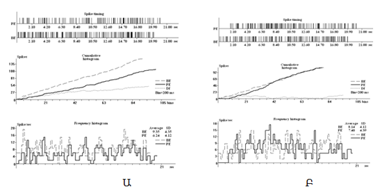 Նկար 2. ԵՎՏԿ-ի ՍԱԿ-ի էլեկտրական խթանմանը հետտետանիկ(Ա) և տետանիկ (Բ) ընկճումով պատասխանող նեյրոնների ժամանակային, կուտակային և միջին հաճախային գծապատկերները (վերևից) ու նրանց քանակական բաշխվածությունը փորձարարական խմբերում (ձախից)