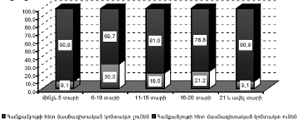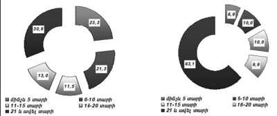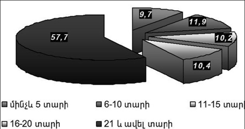 - երկրորդ-երրորդ տեղերը գրեթե հավասար արժեքներով զբաղեցնում են մինչե 5 տարի`(23,3%), 6-10 (21,3%),