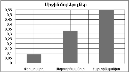 պարունակությունը: Միջին մոլեկուլները հյուսվածքային և շիճուկային ծագման կենսաբանական ակտիվ նյութեր են: Արյան պլազմայում դրանց մակարդակի բարձրացումը հանդիսանում Է կենսա- թաղանթների ներքին թունահարման և կառուցվածքային փոփոխությունների ցուցանիշ: Կախված այն բանից, թե ինչ քանակությ ամբ Է միջին մոլեկուլների պարունակությունն ավելացել արյան պլազմայում, և հաշվի առնելով այն, որ ավիշն ունի գրեթե նույն բա-ղադրությունը, ինչը որ արյունը միայն առանց հեմոգլոբինի, ապա միջին մոլեկուլների պարունակության ավելացումը արյան պլազմայում նշանակում Է՝ներավշում ավելացել են տարրեր, որոնք ազդեցություն ունեն ներավշի՝ֆիզիկամեխանիկական ցուցանիշների վրա: Միջին մոլեկուլների պարունակության ավելացումը արյան պլազմայում բերում Է ներավշի խտության մեծացմանը, իսկ մածուցիկությունը Էական փոփոխություն չի կրում: Կարելի Է եզրակացնել, որ մեզոտիմպանիտի և Էպիտիմպոնիտի դեպքում ներավշի խտությունը ավելանում Է, որը ադեկվատ ազդեցություն ունի նիստագմի ամպլիտուդի վրա: Միջին մոլեկուլները (СМ) դրանք հյուսվածքային և շիճուկային ծագման կենսաբանական ակտիվ նյու-թեր են: Դրանց մակարդակի բարձրացումը արյան պլազմայում հանդիսանում Է կենսաթաղանթների ներքին թունահարման և կառուցվածքային փոփո-խությունների ցուցանիշ: Նախքան անդաստակային հիվանդություններով հիվանդներին համատեղ հա-կաօքսիդանտային բուժման կիրառումը՝կատարելով