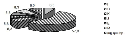 Ստացված արդյունքներն ու դրանց քննարկումը: ԶՊՄԿ աշխատակիցների շրջանում թերապետիկ պրոֆիլի հիվանդացության վերլուծությունդ կատարվել է համաձայն «Հիվանդությունների, վնասվածքների ե մահվան դեպքերի» միջազգային դասակարգման X վերանայման (1992): Հետազոտված անձանցից 25,8%-ը եղել են գործնականում առողջ մարդիկ ե նրանք հետագա հետազոտությունների ցանկում թերապետիկ պրոֆիլի հիվանդացության վերլուծության տեսակետից հետագայում չեն դիտարկվել: ԶՊՄԿ աշխատակիցների շրջանում թերապետիկ պրոֆիլի հիվանդացության ուսումնասիրության համար հավաքված ողջ նյութդ բաշխվել է 7 խմբի (սխեմա 1, նկար 1): 7-րդ խմբում դնդգրկվել են այն բոլոր հիվանդություններդ, որոնցից յուրաքանչյուրդ քանակական տեսակետից առանձնահատուկ դեր չէր կարող կատարել: վերլուծությունը ցույց է տափս, որ թերապետիկ պրոֆիլի հիվանդացության կառուցվածքում առանձնահատուկ տեղ են գրավում նյարդային համակարգի հիվանդություններդ`57,3%: