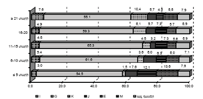 Կարևորել ենք կոմբինատի աշխատակիցների շրջանում հիվանդությունների կոնկրետ դասում աշխատանքային ստաժի կաոուցվածքի փոփոխություններդ (նկար 3): Վերլուծությունդ ցույց է տալիս, որ` իրենց տեսակարար կշոով բոլոր դասերի հիվանդություններդ գերակշոում են 21 և ավելի աշխատանքային ստաժ ունեցող անձանց շրջանում; արյան շրջանաոության համակարգի հիվանդությունների աճ սկսվում է դիտվել, երբ աշխատանքային ստաժդ գերազանցում է 5 տարին, որից հետո դրանց տեսակարար կշիոդ մնում է անփոփոխ մինչև 20 տարի ներաոյալ ստաժ ունեցող-ների մոտ, հետո դիտվում է թռիչքաձև բարձրացում; նյարդային համակարգի հիվանդությունների տեսա-կարար կշիոն սկսվում է աճել, երբ աշխատանքային ստաժդ գերազանցում է 5 տարին, այն մնում է գրեթե նույն մակարդակին, իսկ 20 տարին գերազանցելուց հետո արձանագրվում է 4,5-5 անգամ ավելացում, գրեթե նմանատիպ պատկեր նշվում է նաև բոլոր դասերի հիվանդությունների վերլուծության ժամանակ: