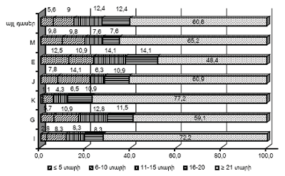 Նկար 3. ԶՊՄԿ աշխատակիցների շրջանում հիվանդությունների կոնկրետ դասում աշխատանքային ստաժի կաոուցվածքը (%)
