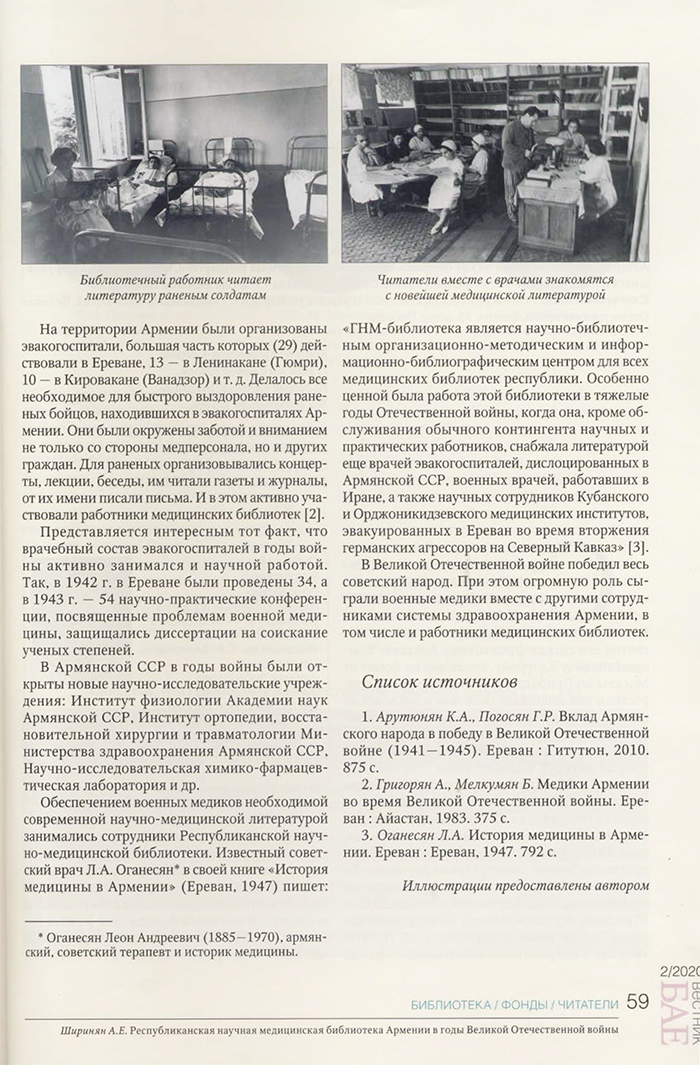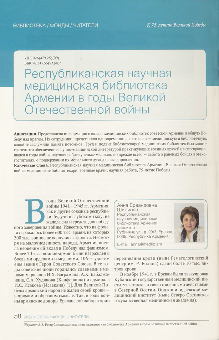 Ներկայացնում ենք ВЕСТНИК БИБЛИОТЕЧНОЙ АССАМБЛЕИ ЕВРАЗИИ հայտնի պարբերականում տպագրված Աննա Շիրինյանի գիտական հոդվածը`«Հանրապետական գիտաբժշկական գրադարանը Հայրենական Մեծ պատերազմի տարիներին», որտեղ նկարագրված է Խորհրդային Հայաստանում բժշկական գրադարանավարների աշխատանքն ու սխրանքը ընդհանուր Մեծ Հաղթանակում (1941-1945 թթ):