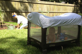 Սավանով ծածկված մանեժ՝ արևից և միջատներից երեխային պաշտպանելու համար: |