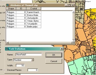 Արդեն ստեղծված պոլիգոնի ներսում վերջինիս հետ ընդհանուր սահնման ունեցող նոր պոլիգոն ստեղծելու համար ավելի հարմար է Պոլիգոնի Ավելացում գործիքը: Նախապես ձեռք բերված տեքստային տվյալներին համապատասխան (պոլիկլինիկայի սպասարկման ոլորտն ըստ փողոցների) մկնիկով հաջորդաբար սեղմում ենք պոլիկլինիկաներից մեկի սպասարկման տարածքի կառուցվելիք պոլիգոնի գագաթների տեղերի վրա, վերջին կետի վրա սեղմում ենք կրկնակի:Պատկերը ավտոմատ վերարտադրվում է քարտեզի վրա: Մյուս պոլիկլինիկաների պոլիգոնները կառուցվում են համանման ձևով, ընդ որում ընդհանուր եզրագծերը նշվում են կրկնակի: Տեսքի Պարունակության աղյուսակում ստացված շեյպ-ֆայլը տեղափոխում ենք նախավերջին դիրք: