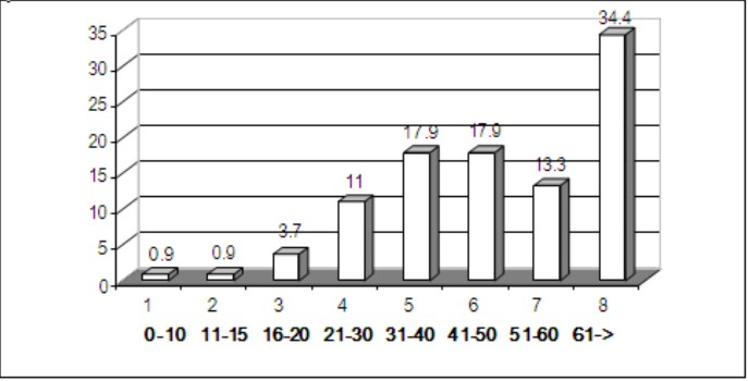 Այսպիսով, մենք առանձնացրել ենք 8 տարիքային խումբ (նկար 1). մինչև 10 տարեկան, 11-15, 16-20, 21-30, 31-40, 41-50, 51-60, ինչպես նաև 61 և բարձր: