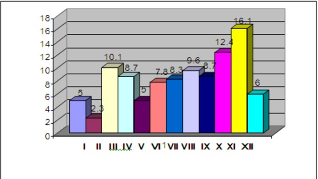 Առավել մեծ ցուցանիշներ են նկատվում հուլիս, նոյեմբեր և դեկտեմբեր ամիսներին (համապատասխանաբար 121` 9.9%, 152`12.5% և 116` 9.5%): Մեծ թիվ են կազմում նաև հոսպիտալացման դեպքերը հունվարին (104 դեպք` 8.5%), հունիսին (100 դեպք` 8.2%) և հոկտեմբերին (113 դեպք` 9.3%): Խմբավորված տվյալների վերլուծությունն ըստ տարվա եղանակների ցույց տվեց, որ հոսպիտալացման դեպքերի 23.7%-ը տեղի են ունենում ձմռան, 21.2%-ը` գարնան, 25.7%-ը` ամռան և 29.4%-ը` աշնան ամիսներին: