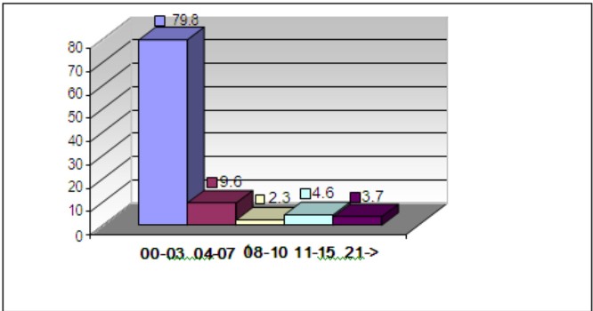 Հիվանդանոցում անցկացրած օրերի քանակի վերլուծությունը, որն իրականացվել է ըստ օրերի խմբավորված ցուցանիշների, ցույց տվեց, որ ՃՏՊ-ներից տուժածների ճնշող մեծամասնությունը բժշկական հաստատություններումմահանում են առաջին շաբաթվա ընթացքում: Ըստ որում այդ տոկոսը կտրուկ տատանվում է: Այսպես, մինչ առաջին օրվա լրանալը մահանում է տուժածների 51.4%-ը, 1-3-րդ օրերի ընթացքում` 28.4%-ը, իսկ 4-7- րդ օրերի ընթացքում` 9.6%-ը (նկար 5): Վերոնշյալը ՃՏՊ-ների հետևանքով տուժածների բուժօգնության տակտիկայի վերանայման նպատակով, ավելի մանրամասն հետազոտությունների անհրաժեշտություն է առաջացնում: