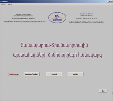 - Մշակված են հատուկ քարտեր, իրականացված է նյութի հավաք և կազմված է համակարգչային տվյալների բազա (Epi Info for Windows համակարգչային փաթեթի հիմքի վրա)` ըստ ՃՏՏ-ի արդյունքում մահացածների, հոպիտալացվածների և ամբուլատոր- պոլիկլինիկական բուժօգնության դիմածների: