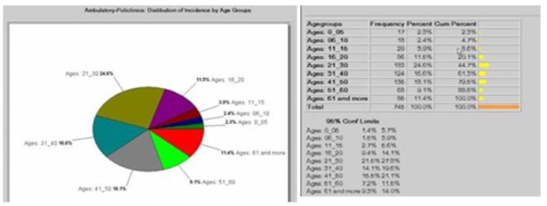 ՃՏՏ-իարդյունքումամբուլատոր-պոլիկլինիկական դեպքերի բաշխվածության վերլուծությունն ըստ տարիքի, ցույց տվեց, որ գրանցված ամբուլատոր բուժման դեպքերից ամենացածր տարիքը եղել է 1 տարեկանը (1 դեպք), իսկ ամենամեծը` 86 տարեկանը (1 դեպք): Ամբուլատոր-պոլիկլինիկական բոլոր դեպքերի տարածվածությունն այս սահմանում է (համարյա 85 տարի)` տարբեր հասակներում տարբեր մեծություններով:
