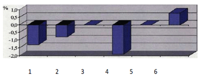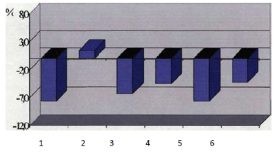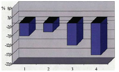 Рис.1. Изменение (в %) суммы мезиодистальных размеров зубов у детей 7-14лет с мезиальной окклюзией по сравнению с нормой.