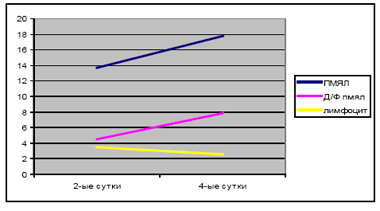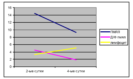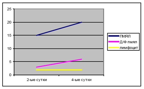 При цитологическом изучении мазков- отпечатков экссудата из ран больных мы выявили закономерности количественных изменений клеточных элементов. Забор экссудата из ран проводился у всех больных на 2-ой и 4-ый день после вскрытия гнойного очага, а у исследуемой группы на 2-ой день перед началом ЛТ и на 4-ый день после двукратного ЛВ. В мазках-отпечатках подсчитывалось количество полиморфноядерных нейтрофильных лейкоцитов, их дегенеративных форм и лимфоцитов. Анализ их количественных изменений на 4-ый день, при обяза-тельном сравнении со 2-ым днем, дает возможность судить об адекватности проводимого лечения. Коли-чественные изменения клеточного состава в экссудате из ран больных контрольной группы представлены на диаграмме 1.