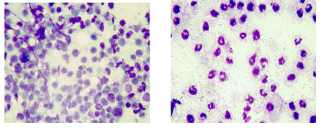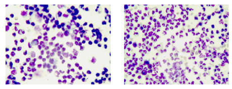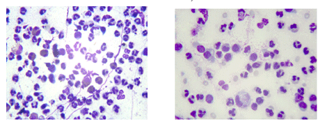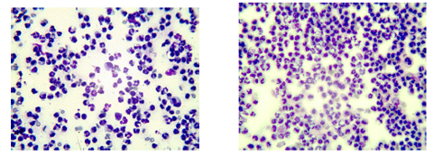 Видно снижение количества всех исследуемых клеточных элементов на 4-ый день. На фотографиях цитограмм отображены наиболее характерные изме-нения клеточного состава при передозировке ЛВ на 2-ой и 4-ый день (рис.5,6).