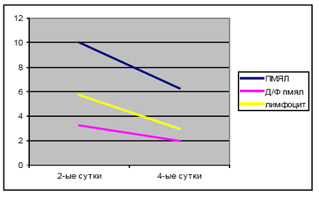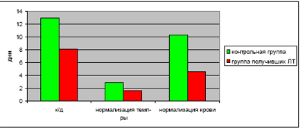 Как видно из таблицы, продолжительность лечения в исследуемой группе составила 8.1 дня. По сравнению с контрольной группой (12.9 к/д), имеется сокращение длительности лечения на 38%. Мы отмечали также выраженное ускорение нормализации температуры и показателей крови. Нормализация температуры у больных, получивших ЛТ, происходила к середине 2-ых суток, а у больных в контрольной группе - к концу 3-их. Что касается сроков нормализации показателей крови, то в исследуемой группе они сократились в два раза по сравнению с контрольной.