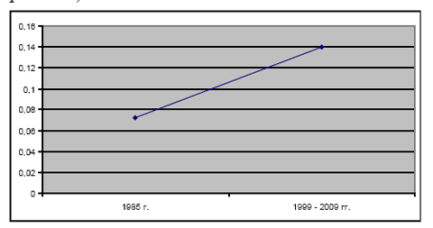 Результаты и обсуждение Ретроспективное сравнение результатов наших исследований с 1999 по 2009гг. с материалом 1985г. показало, что среднегодовой показатель заболеваемости населения Армении первичным раком щитовидной железы с 1999 по 2009гг. составляет 0,14, что выше среднегодового показателя 1985г. в 2 раза (диаграмма 1).