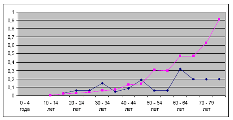 Из данных1985г. (диаграмма 2), видно, что наибольшая заболеваемость 0,32 ± 0,18 отмечена в возрастной группе 60-64 лет (п = 3; р ‹ 0,05). С 1999 по 2009гг. по нашим исследованиям наибольшая заболеваемость отмечена в возрастной группе 80 и старше лет - 0,91 ± 0,47 (п = 3,7; р ‹ 0,001).