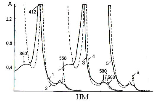 Рис.3. Оптические спектры поглощения фракций цит b558 кислого характера из клеточных формирований печеночной ткани крыс: из ядер клеток крыс-самцов (1) и самок (2),из митохондрий клеток самцов (3) и самок (4), из мембран клеток самцов (5) и самок (6). Цит b558 растворены в 0,1 М КФБ