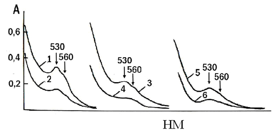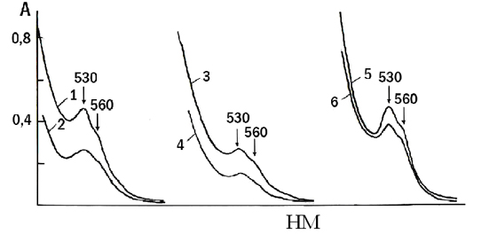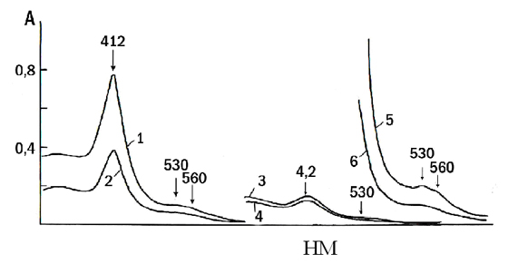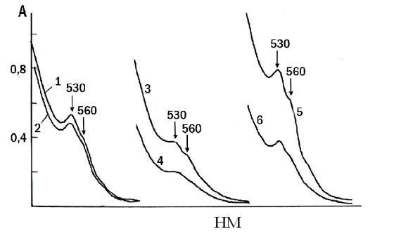 Рис.1. Оптические спектры поглощения фракций цит b558 кислого характера из клеточных формирований селезенки крыс-самцов: из мембран клеток (1) и после его восстановления дитионитом натрия (2), из ядер клеток (3) и после его восстановления (4), из митохондрий (5) и после его восстановления (6).