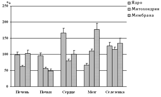 Цель работы – изучение количественных и качественных изменений ПМ и АМ в мембранах, ядрах, митохондриях и АМ в цитозолях клеток тканей (печень, почки, сердце, селезенка и костный мозг) интактных крыс-самок и самцов