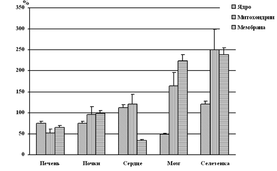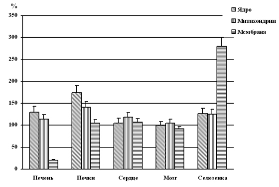 Опыты проводились на белых половозрелых крысах обоих полов массой 200-250 г (по 7 животных в каждой серии эксперимента). Ткани крыс-самцов и самок в отдельности (печень по 10г, почки–5г, селезенка–4г, сердце–4г, мозг–7г), после их промывания физ. раствором, гомогенизировали в 0,25 М сахарозе (1г ткани в 10 мл сахарозы) стеклянным гомогенизатором в течение 1,5 мин при 4о. Ядра, митохондрии и мембраны клеток осаждали дифференциальным центрифугированием. Осадки этих клеточных компонентов двукратно промывали раствором сахарозы (1:10 об/об) с последующим центрифугированием. Далее осадки ядер, митохондрий и мембран клеток (МК) промывали водой (1:20 об/об) и центрифугировали. Очищенные от следов сахарозы и солей осадки ядер, митохондрий и МК смешивали с водой (1:5 об/об) и гомогенизировали в аналогичном режиме.