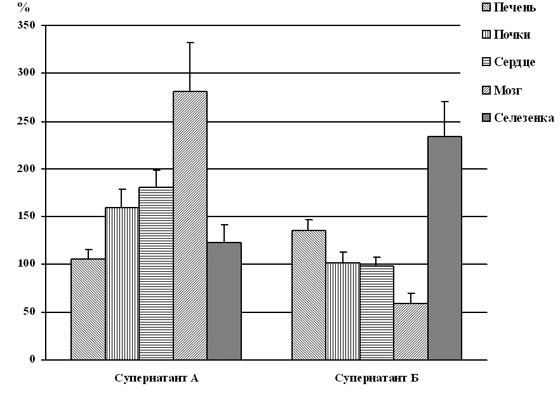 Рис.9. Относительное изменение (%) активности суммарной фракции СОД-1 и СОД-2 (супернатант А) и каталазы (супернатант Б) клеток тканей крыс-самок, по сравнению сo 100% показателями крыс-самцов (Р‹0,05)