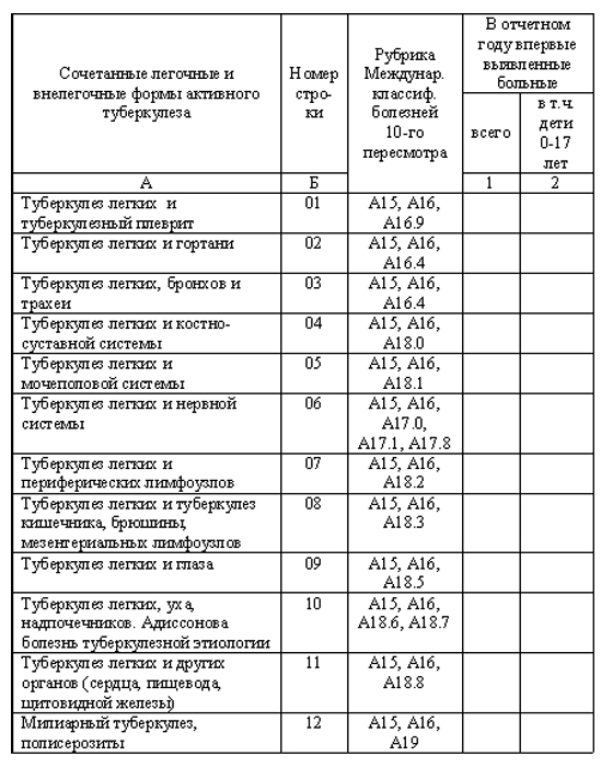 Безусловно, в отчетной форме каждый впервые выявленный больной должен учитываться однократно. Но при анализе эпидемиологической ситуации и составлении ежегодных обзоров по туберкулезу эта форма поможет иметь полное представление о числе случаев полиорганного туберкулеза и отдельно о числе каждой ее локализации, т.е. сумме больных с изолированным внелегочным туберкулезом и их сочетаний с туберкулезом органов дыхания. Это важно для правильной диагностики и повышения эффективности лечения данных форм туберкулеза.