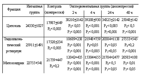 В отношении синтеза белка во фракции эндоплазматического ретикулума зарегистрированы следующие сдвиги. После 5 часов компрессии особых сдвигов не наблюдается. Однако уже через 2 ч декомпрессии эта величина подавляется более чем в 2 раза, столь же резко (в 3,3 раза) повышается через 4 ч декомпрессии, остается выше интактного уровня спустя 24 часа после компрессии и снижается к 48 ч декомпрессии, оставаясь вдвое активнее периода 2 ч декомпрессии.