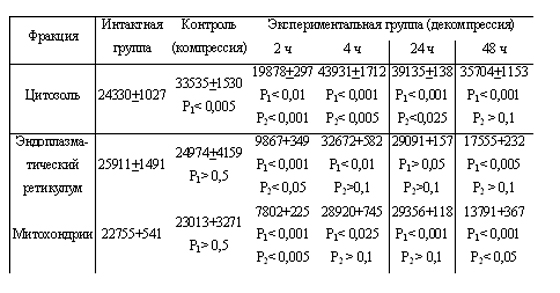 Белоксинтезирующая активность митохондриальной фракции в период компрессии не подвергается изменениям, резко подавляется в период 2- и 4-часовой декомпресии (соответственно на 47 и 32,7%) и приравнивается к интактному уровню через 24 и 48 ч декомпрессии (табл. 1).