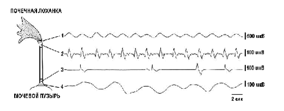 Опыты проводили на крысах массой 250 – 300 г., наркотизированных нембуталом (50 – 55 мг/кг) внутрибрюшинно. Мочеточник денервировали путем перерезки корешков чревного и тазового нервов. Подробное описание данной методики представлено в предыдущей работе [3]. Спайковые разряды из околопочечного и околопузырного участков органа отводили биполярными электродами. Медленноволновую активность околопузырной зоны регистрировали введением шарикового электрода через мочевой пузырь в область соединения мочеточника с мочевым пузырем.